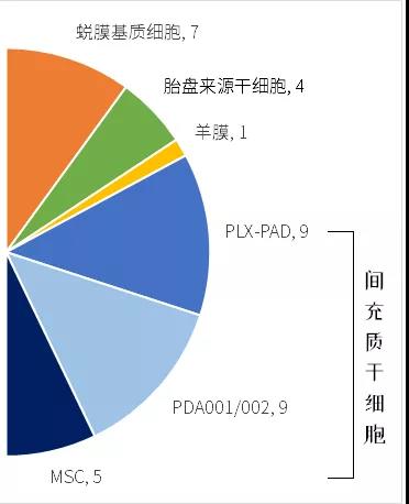 從細(xì)胞來(lái)源來(lái)看,66%(23項(xiàng))為間充質(zhì)干細(xì)胞;20%(7項(xiàng))為蛻膜基質(zhì)細(xì)胞;11%(4項(xiàng))登記為胎盤來(lái)源干細(xì)胞,其中2項(xiàng)是聯(lián)合臍帶血造血干細(xì)胞應(yīng)用。