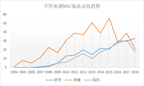 從趨勢(shì)來(lái)看,骨髓和脂肪相關(guān)研究在2016-2018出現(xiàn)下降,而臍帶相關(guān)研究持續(xù)增長(zhǎng)。