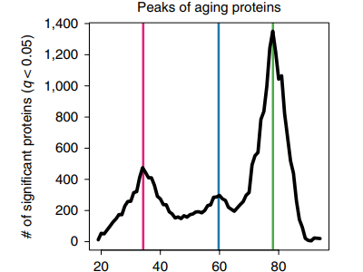 2019年底發(fā)表在Nature上的一篇文獻顯示,Wyss-Coray等人分析了來自4263名18-95歲人群的血漿后發(fā)現(xiàn):在人類生命周期中,衰老并不是勻速發(fā)展的,而是似乎在三個時間點有劇烈波動,這三個點平均發(fā)生在34歲,60歲和78歲。