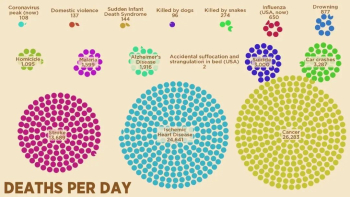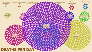 Abacaba以2月10日COVID-19造成的108人死亡作為參照(左上角),全球每天死于家庭暴力的人數(shù)(137)已經(jīng)超過了這個數(shù)字,而腫瘤、缺血性心臟病和休克每天分別造成26283人、24641人和13689人死亡。截至2月25日,COVID-19造成的死亡人數(shù)還低于車禍每天造成的死亡人數(shù)(3287)。