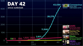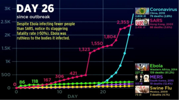 外網(wǎng)UP主Abacaba在2月12日上傳了一個視頻,引用數(shù)據(jù)比較了COVID-19、2015年的MERS、2014年的Ebola、2009年的墨西哥流感(H1N1)、2003年的SARS及1918年的西班牙流感(H1N1),并同步了時間軸起點,試圖直觀的展示各種病毒的不同表現(xiàn)。