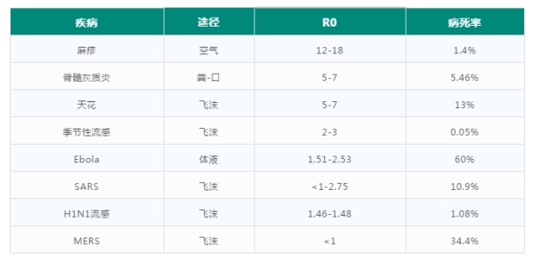 各種病毒性疾病的基本傳染數(shù)R0值(值越高,傳染性越強)和病死率: