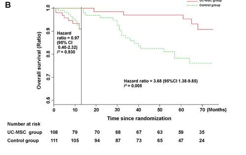 生存率改善:通過Landmark分析,在13個月至75個月的隨訪期間,臍帶干細胞治療組的總生存率明顯高于對照組。