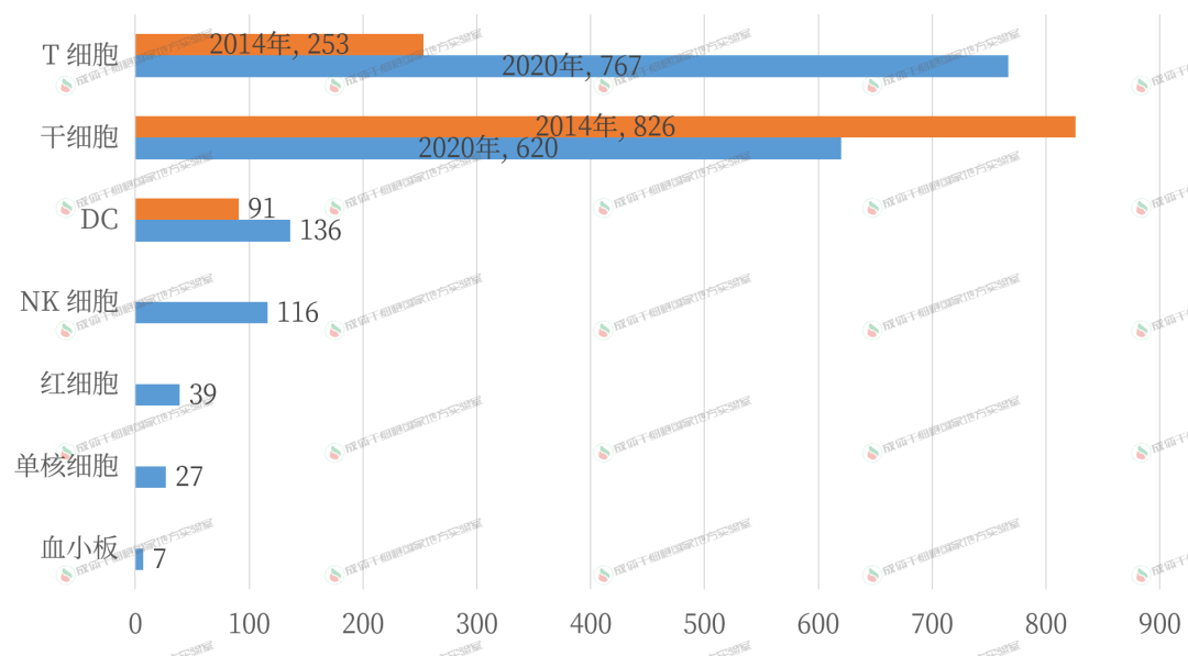 5 年前,僅僅是間充質(zhì)干細(xì)胞的臨床試驗(yàn)數(shù)量就超過(guò)了所有免疫細(xì)胞的總和?,F(xiàn)在的情況則反過(guò)來(lái),僅僅是 T 細(xì)胞的臨床試驗(yàn)數(shù)量就超過(guò)了所有干細(xì)胞的總和。