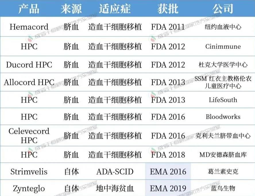 目前獲批的造血干細(xì)胞療法是 10 種。包括 FDA 的 8 種臍血產(chǎn)品,都用于血液病和免疫缺陷的治療。EMA 批準(zhǔn)了 2 種自體造血干細(xì)胞基因療法,Strimvelis 用于腺苷脫氨酶缺乏癥 (ADA-SCID),Zynteglo 用于治療輸血依賴性地中海貧血癥。