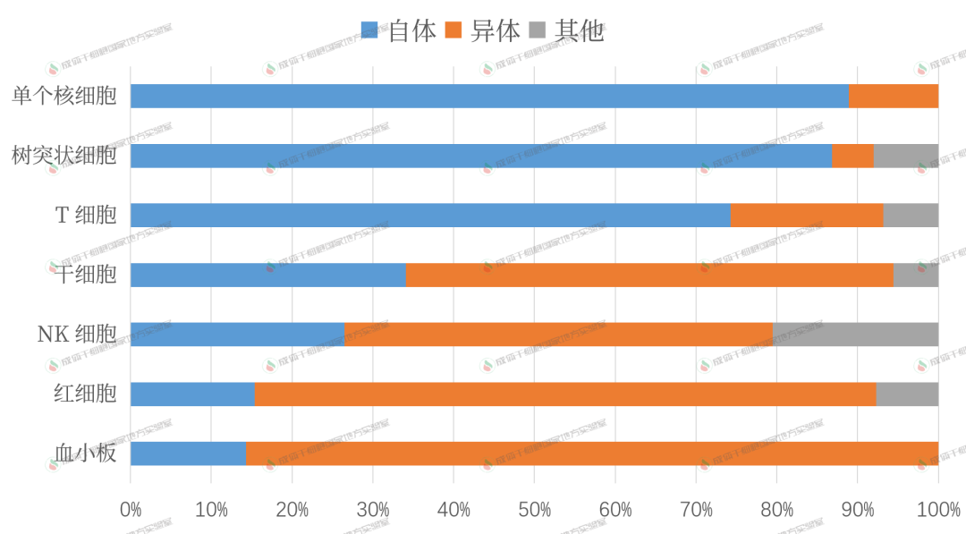 而在使用異體細(xì)胞的情況中,造血干細(xì)胞(61%)是因?yàn)橐浦餐ǔ>褪怯媒】导?xì)胞替換患者細(xì)胞,間充質(zhì)干細(xì)胞(65%)是因?yàn)楸旧砻庖咴缘停琋K 細(xì)胞(53%)是由于 KIR 錯(cuò)配的異體 NK 細(xì)胞既減少排斥,也能提高抗腫瘤作用。